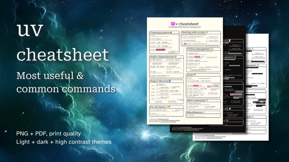 You can also find this cheatsheet as a blog post at https://mathspp.com/blog/uv-cheatsheet.